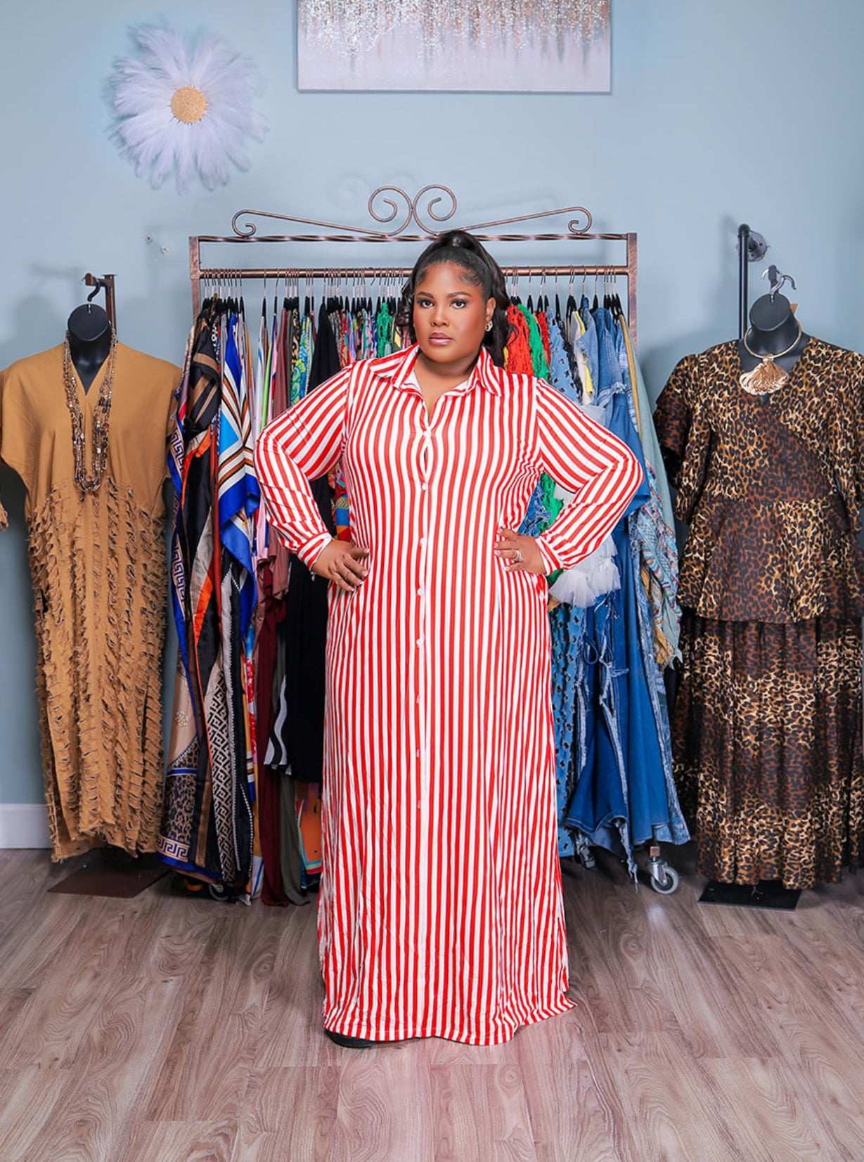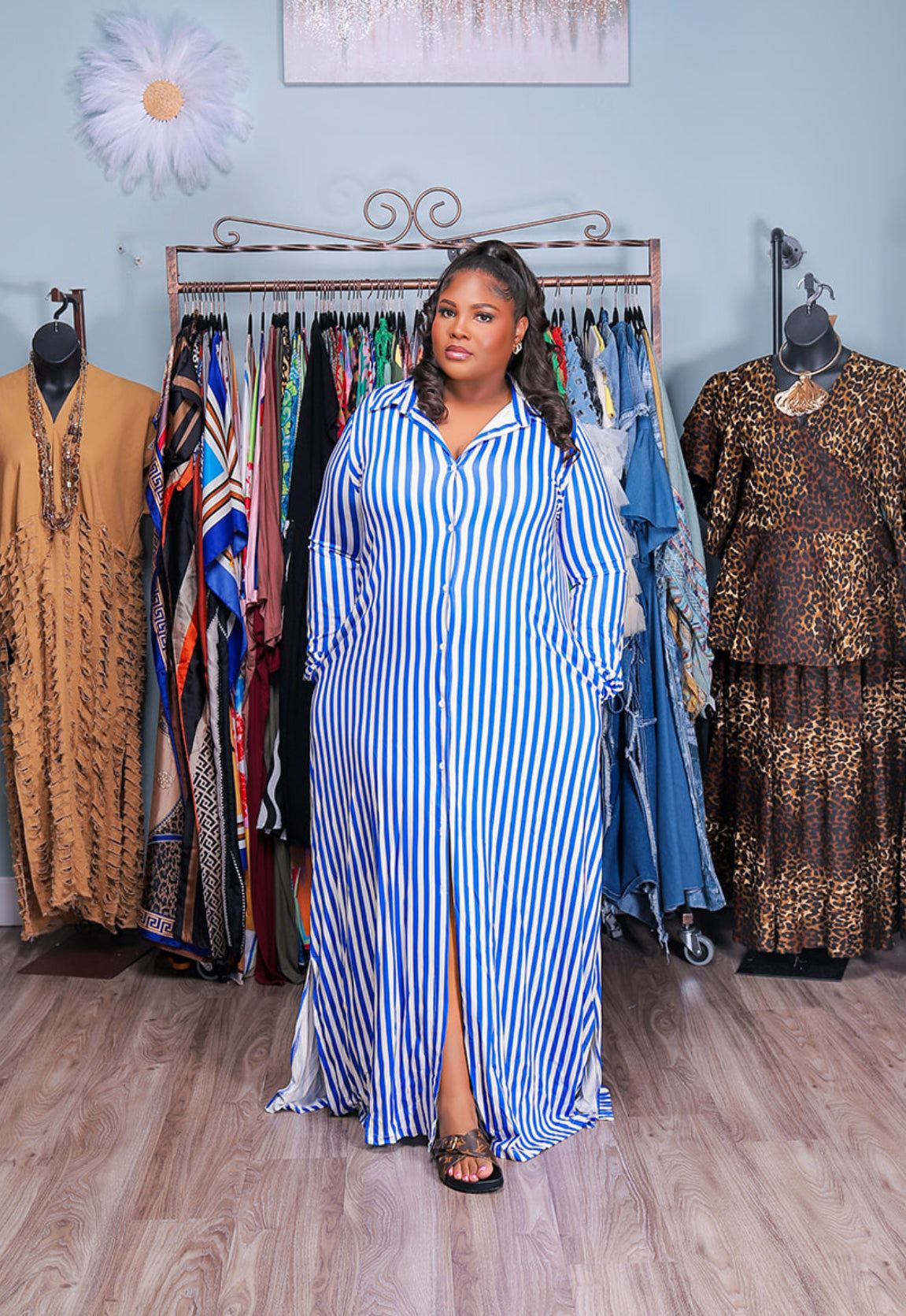 Turn heads with effortless style in our bold striped maxi shirt dress. Featuring a button-down front, collared neckline, and long sleeves, this piece blends comfort with chic sophistication. The vertical stripes elongate your figure, while the relaxed fit makes it easy to wear from day to night. Perfect for brunch dates, casual outings, or making a statement at any event.