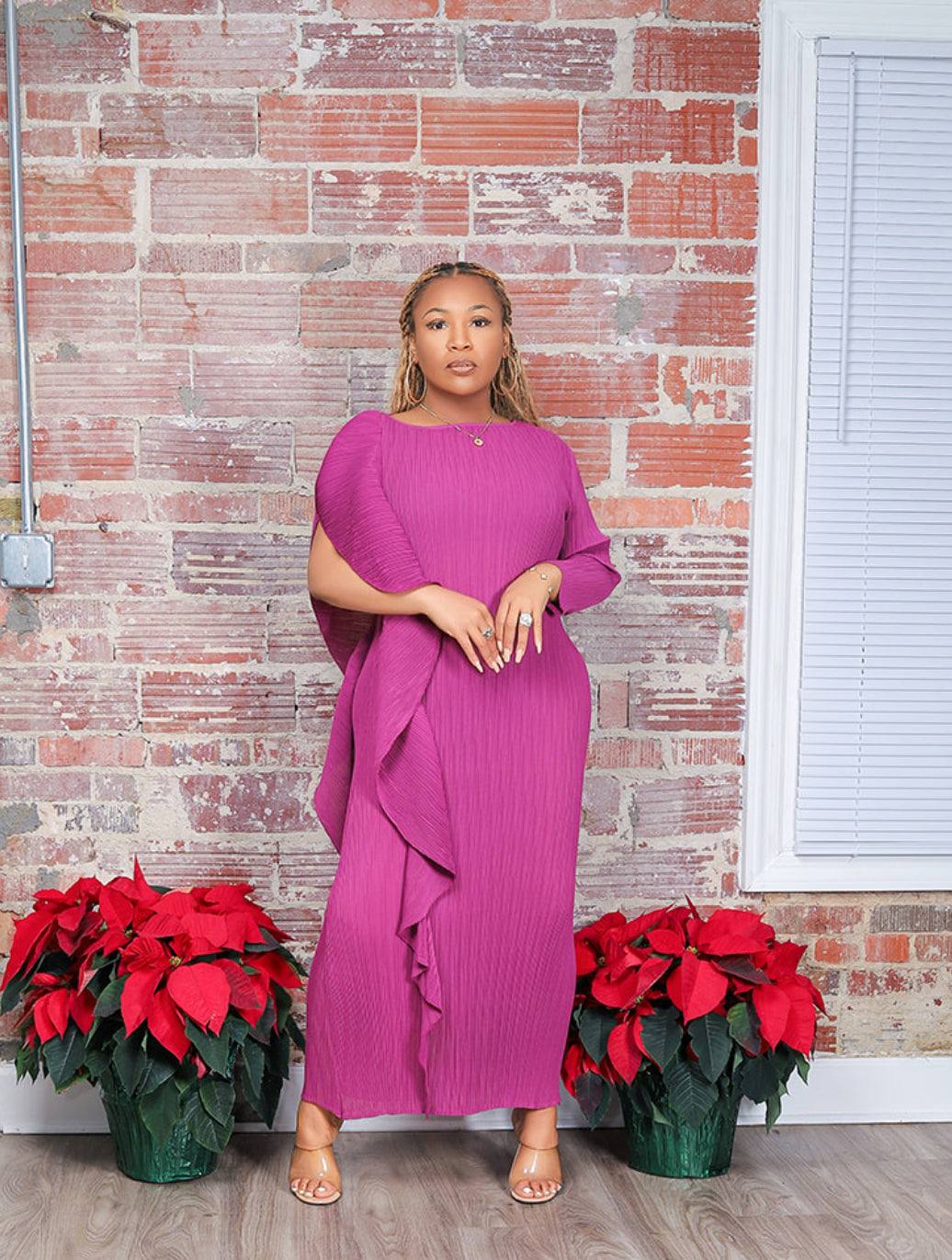 This stunning flowy maxi is designed to move with you while giving soft drama in all the right places. Featuring a textured pleated fabric and a cascading ruffle detail, this dress brings classy elegance with a modern twist. The relaxed silhouette makes it flattering, comfortable, and easy to style for any occasion.