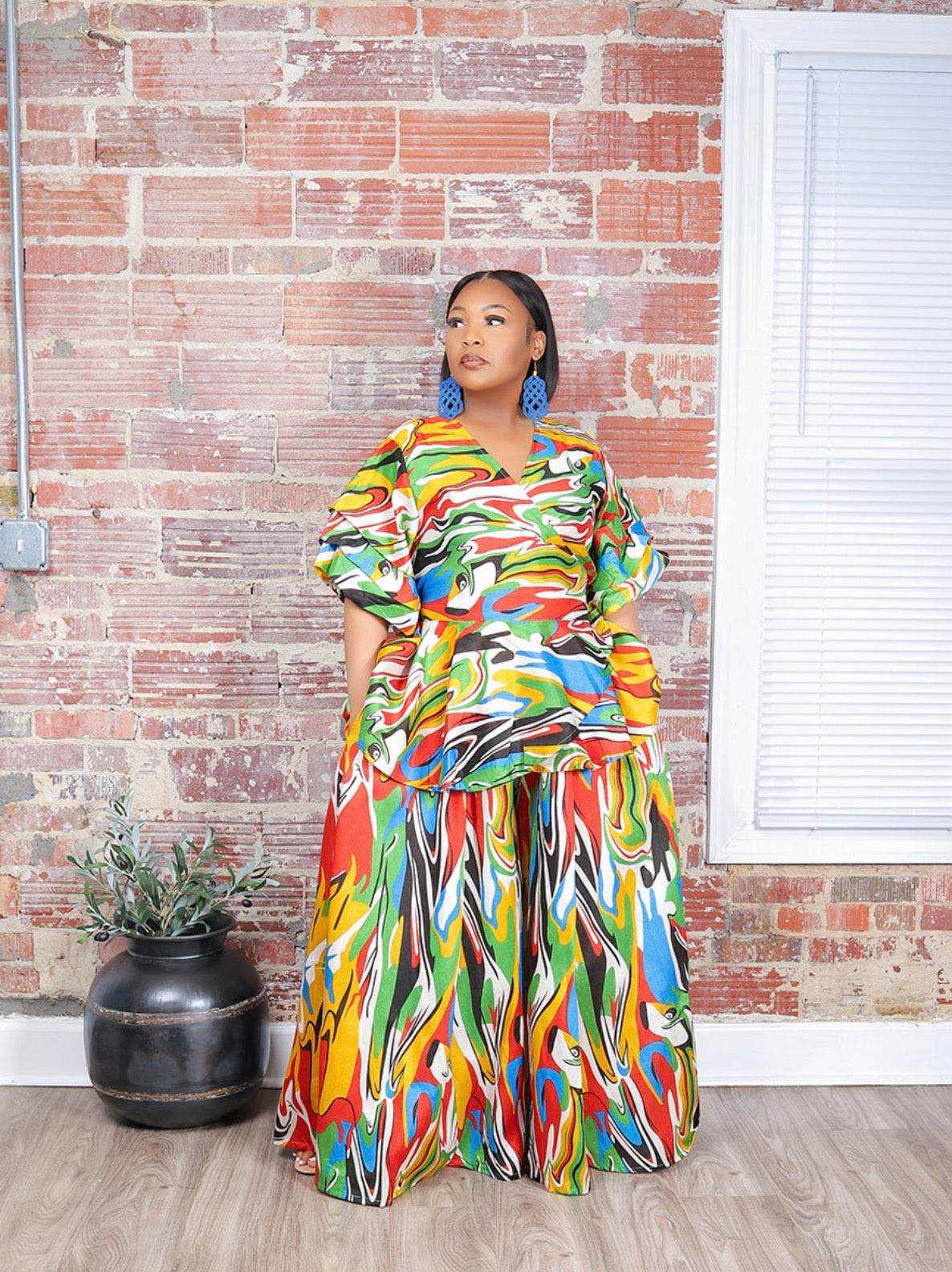 Make an entrance without saying a word. 💥 This vibrant two-piece set is for the woman who isn’t afraid of color, confidence, and compliments. Featuring a flowy V-neck top with dramatic layered sleeves and matching wide-leg palazzo pants, this set moves beautifully and feels just as good as it looks.