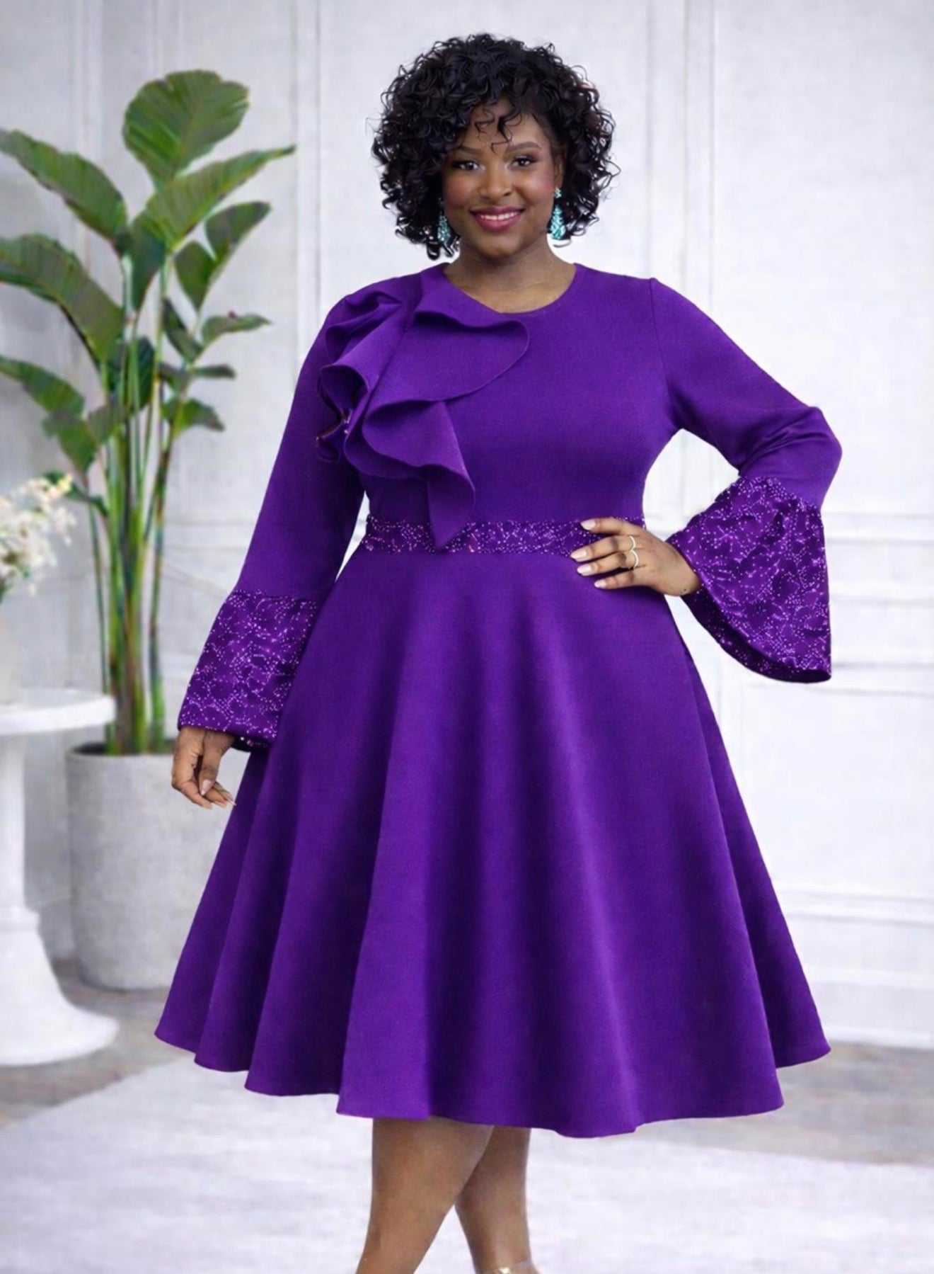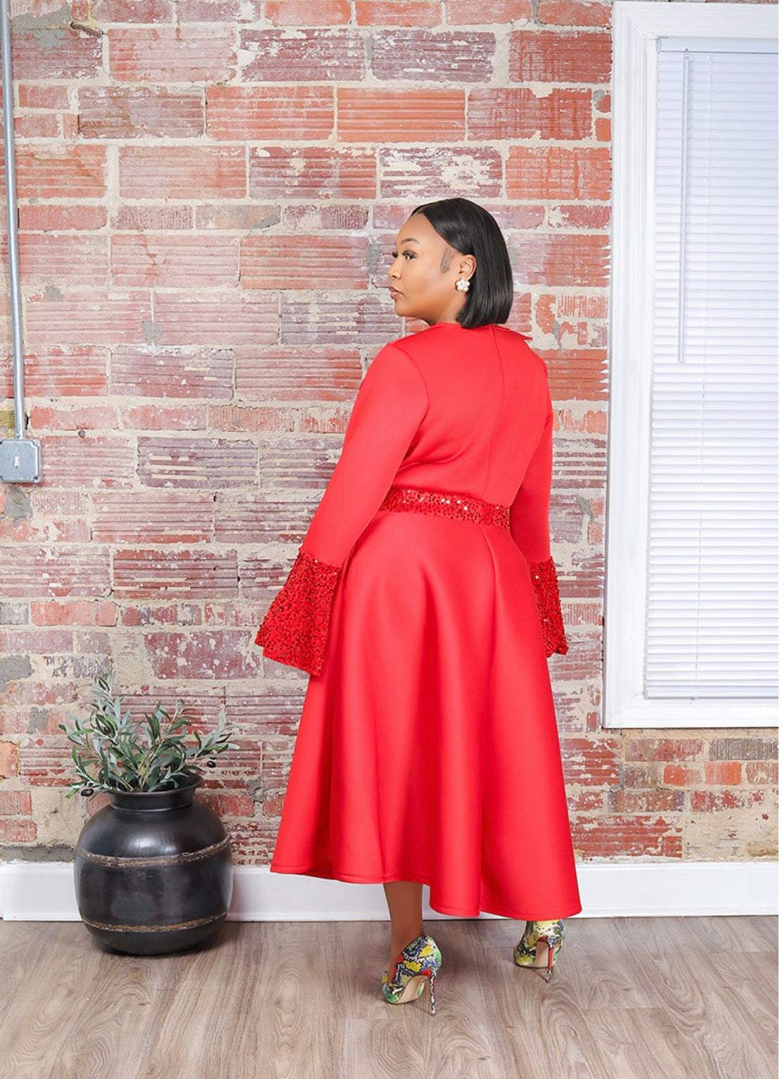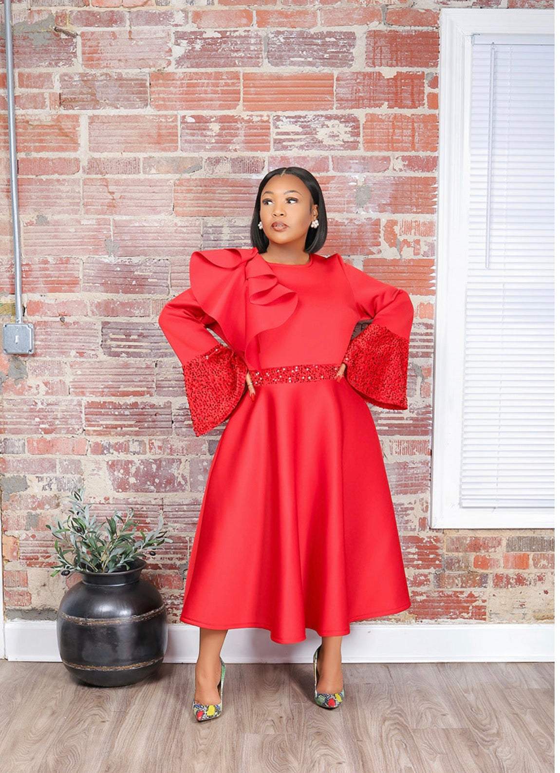This stunning fit & flare silhouette features a dramatic ruffle detail at the neckline, beautifully textured bell sleeves, and a flattering defined waist that enhances your natural shape. The full skirt gives you that elegant twirl moment while still keeping it classy and sophisticated.