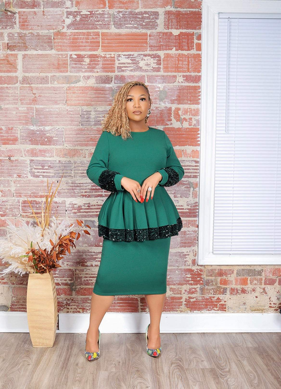 The Grace & Authority Peplum Dress was designed for the woman who commands a room without ever raising her voice. Featuring a structured peplum waist that defines and flatters your silhouette, this elegant midi dress blends sophistication with subtle sparkle.
