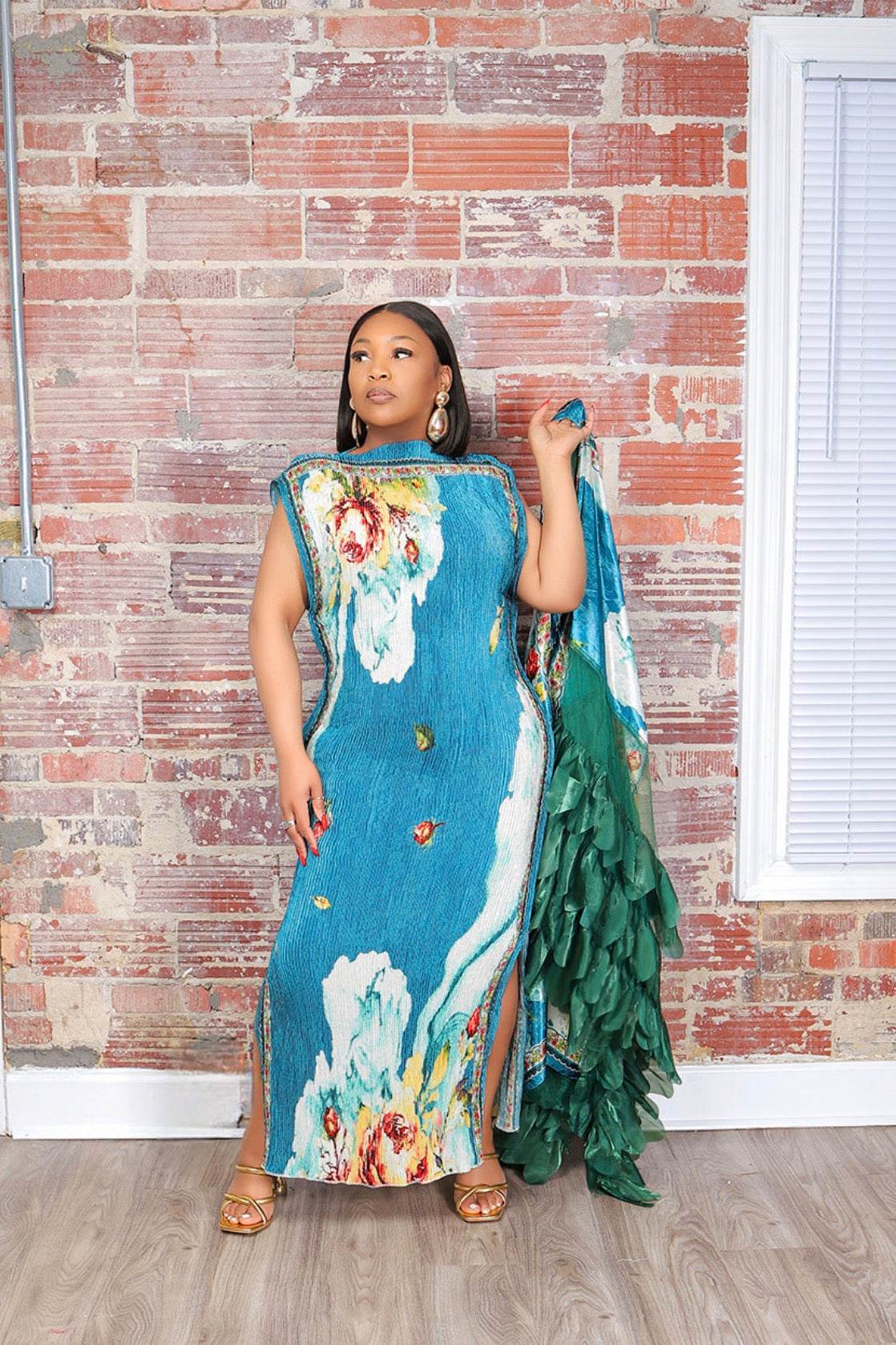 The matching headpiece and dramatic ruffle overlay take this piece to another level. Wear it fully styled for church, special occasions, galas, or elevate it by removing the overlay for a sleek, curve-loving silhouette.