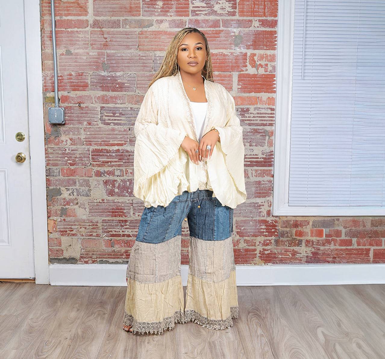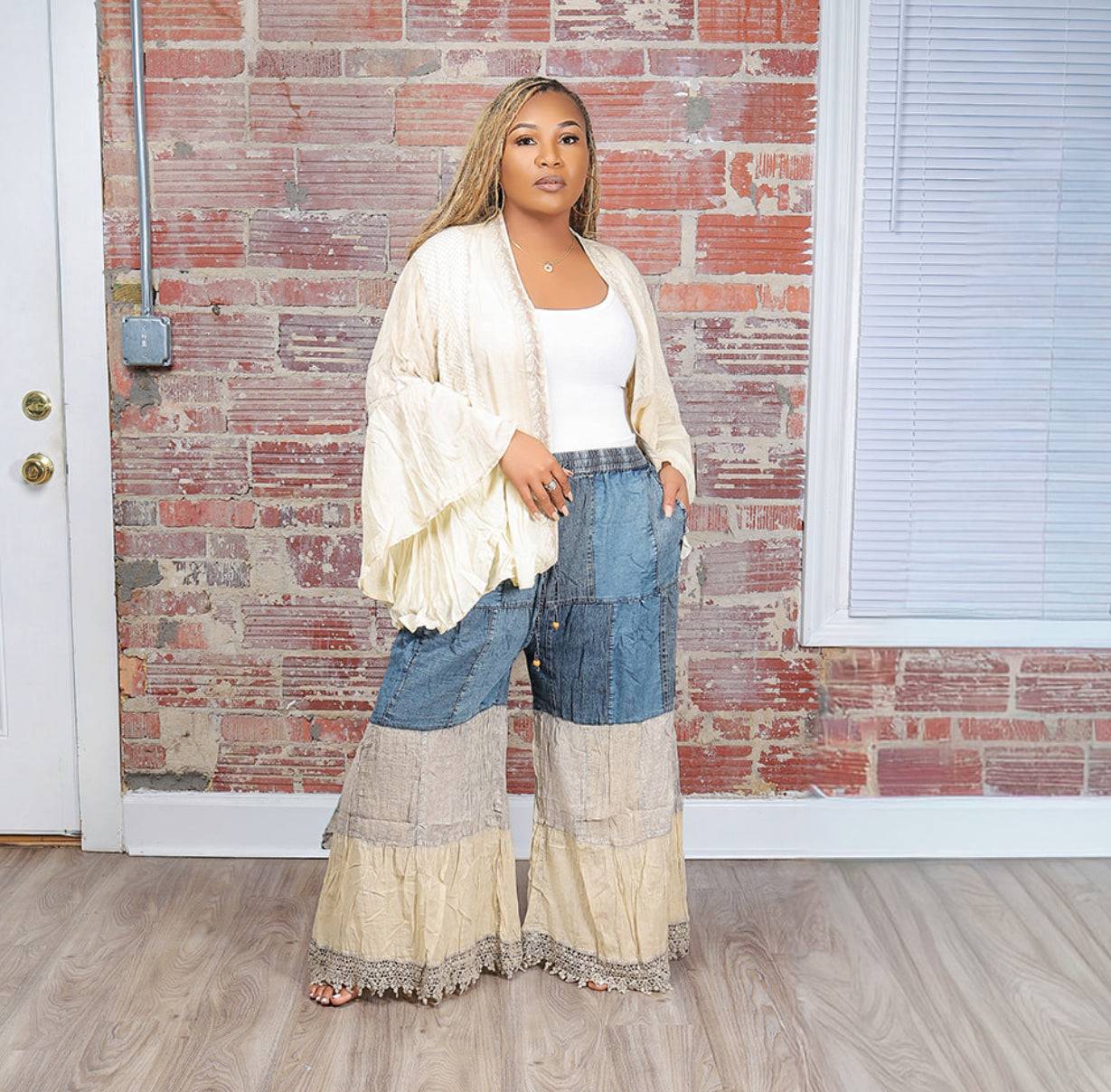 Step into effortless style with this one-of-a-kind boho patchwork set — where comfort meets confidence. This two-piece look features a lightweight, flowy kimono top with dramatic bell sleeves and a relaxed fit that flatters every body type. The coordinating wide-leg pants bring the perfect touch of vintage flair with denim-inspired patchwork and a soft, tiered finish that moves beautifully with every step.