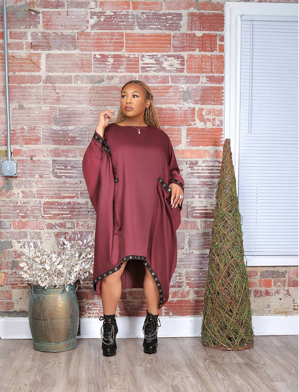 Easy, effortless, and unapologetically stylish the Grommet Edge Tunic Dress is your go-to for comfort with a statement. Designed with a relaxed tunic silhouette, this piece flows beautifully on the body while the grommet trim adds just the right touch of edge.