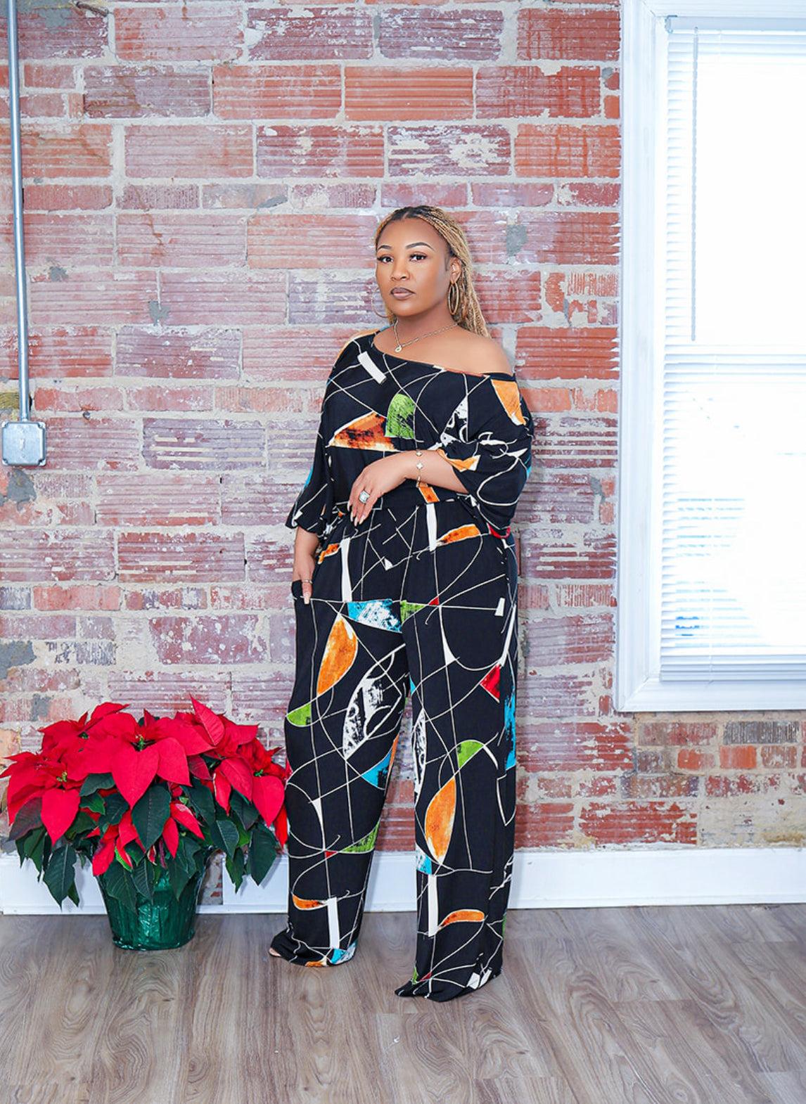 Make an entrance without saying a word. This bold abstract two-piece set is giving effortless confidence with a splash of art. Featuring a relaxed off-the-shoulder top paired with flowy wide-leg pants, this set is designed to move with you while keeping you comfortable and chic.