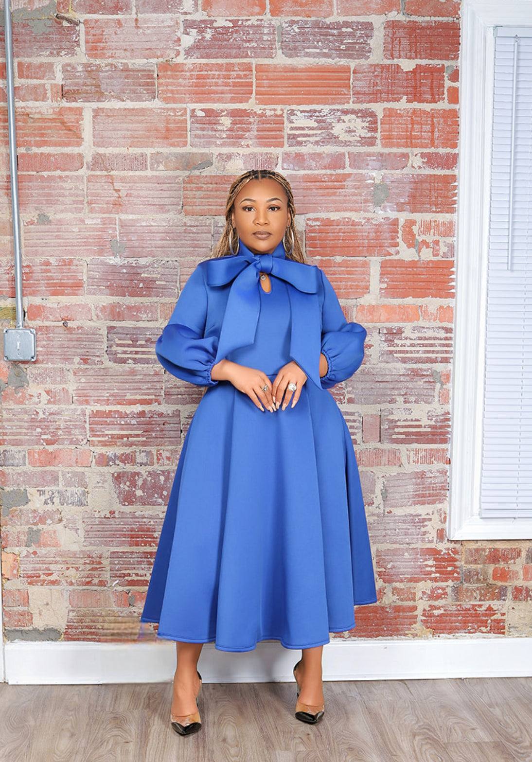 This statement midi dress is designed to bring elegance, confidence, and timeless style all in one look. Featuring a dramatic bow neckline and puff sleeves, this dress delivers the perfect balance of classy and bold.