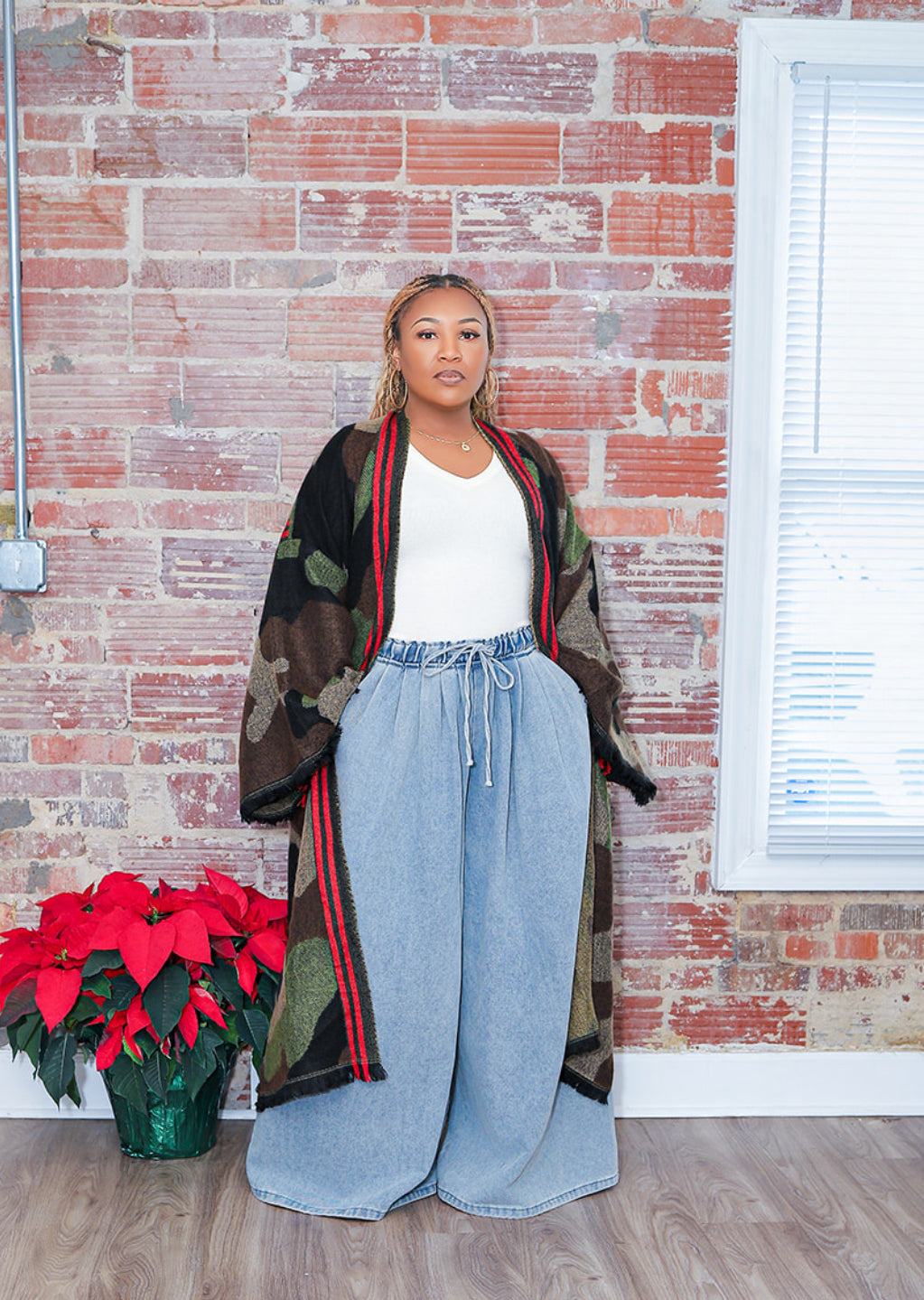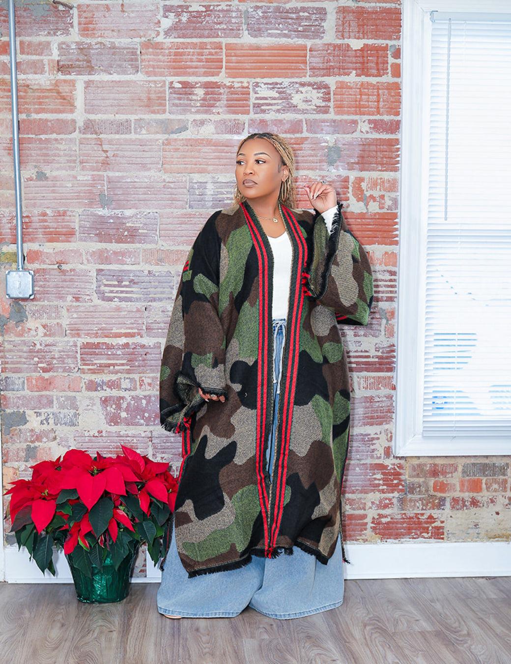 Our Camo Luxe Statement Cardigan is the definition of bold comfort. Designed with an oversized, flowy silhouette and eye-catching red trim detail, this piece instantly elevates a simple tee and denim look.