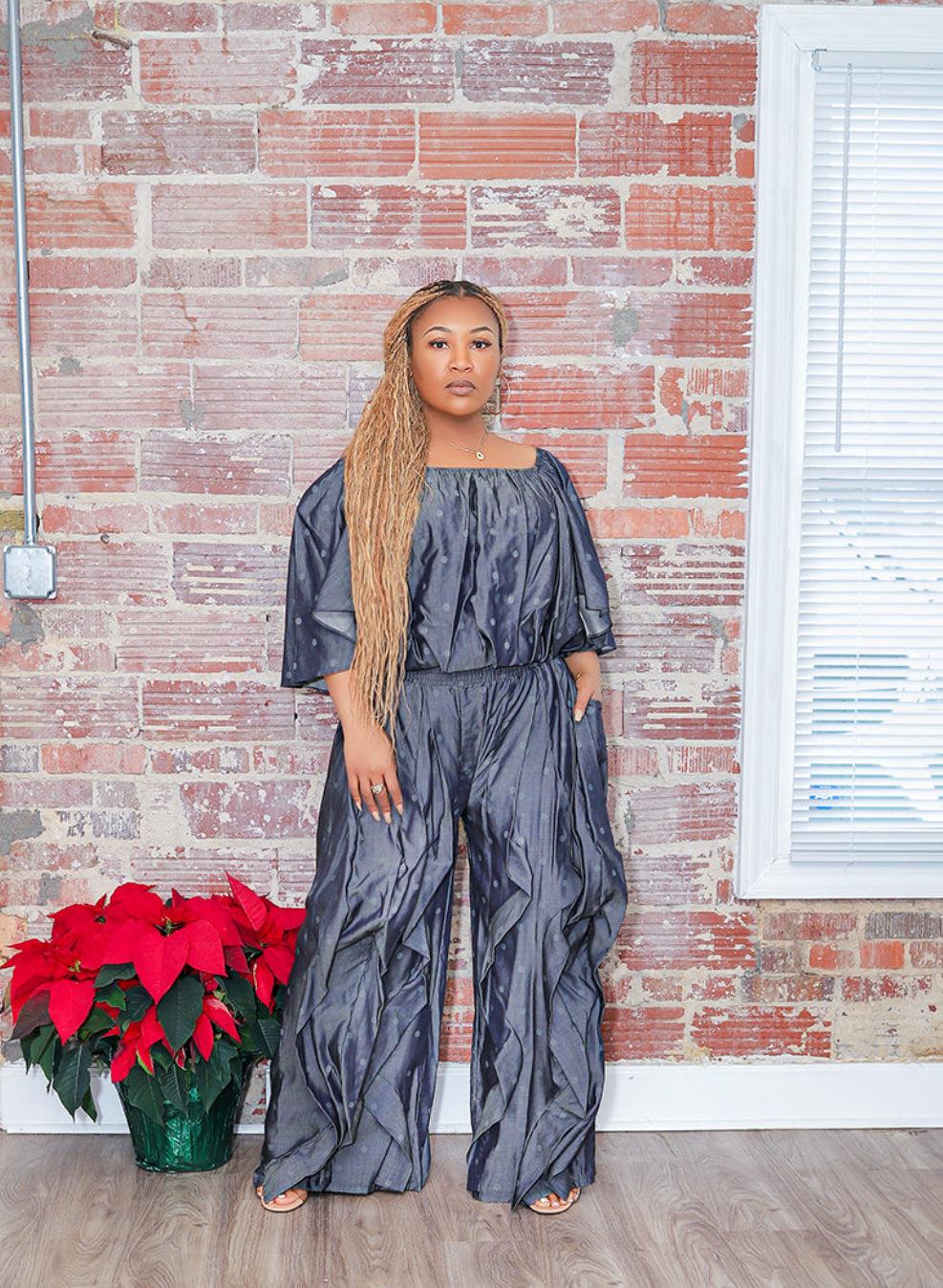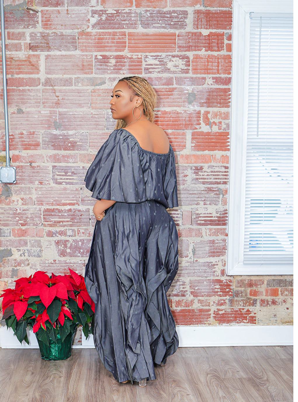 This flowy two-piece set features a soft off-the-shoulder top paired with matching wide-leg pants that move beautifully with every step. Lightweight, breathable, and easy to wear, this set gives luxury without the extra effort.