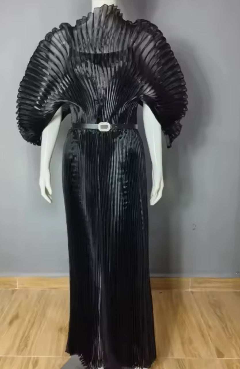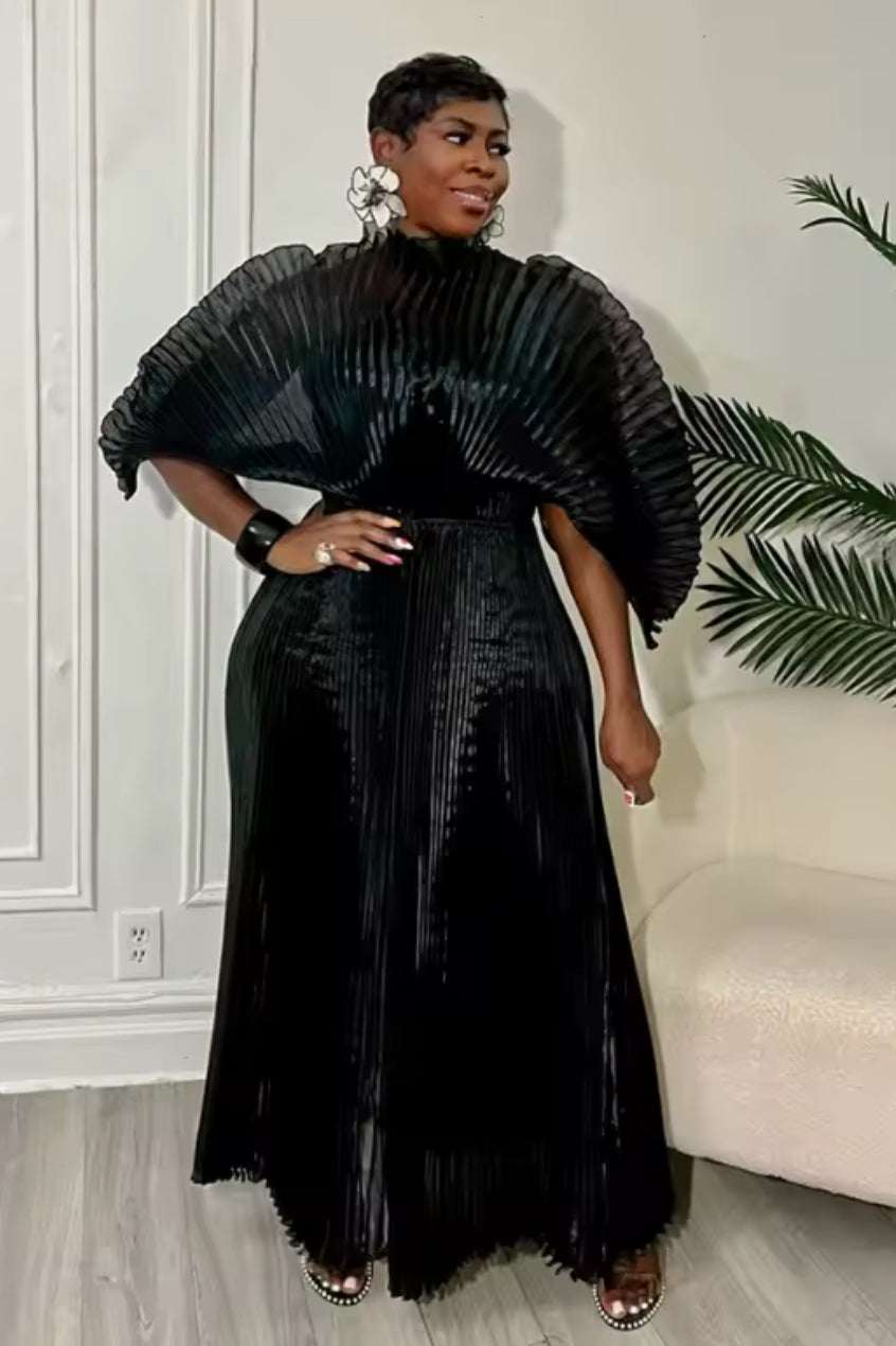 Turn heads the moment you walk into the room. This elegant pleated gown features dramatic wing-style sleeves and a flowing A-line silhouette that blends sophistication with bold flair. Perfect for galas, weddings, and upscale events, this piece is designed for the woman who loves to make an unforgettable entrance.
