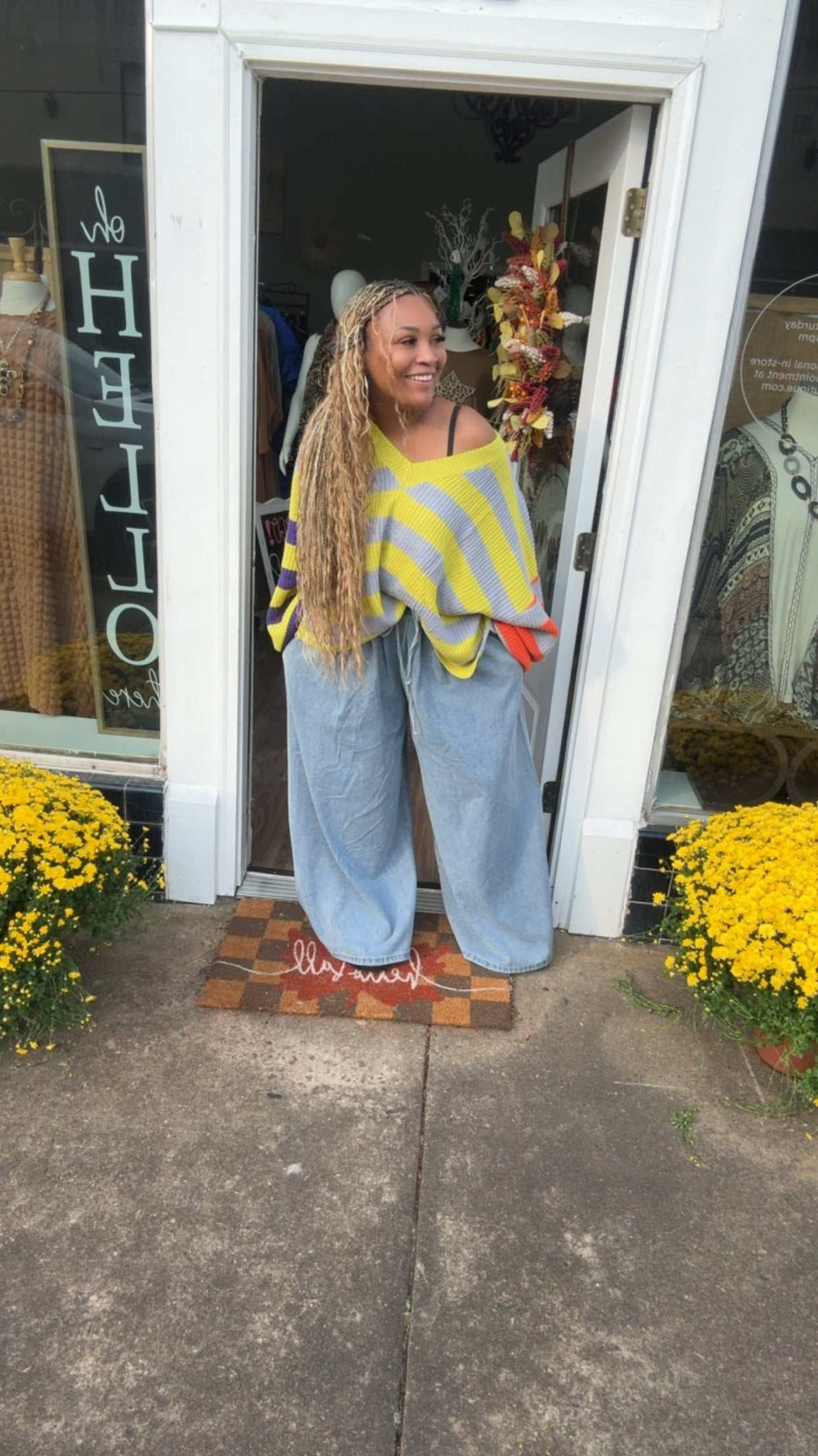 Cozy meets chic with our Oversized Striped Sweater. Designed with a slouchy, off-the-shoulder fit, this sweater adds effortless style to your everyday look. The bold mix of lime green, lavender, and orange stripes makes it the perfect statement piece for fall. Soft knit fabric keeps you warm while still feeling lightweight and breathable. Pair it with jeans, leggings, or our wide-leg pants for a relaxed yet stylish vibe.