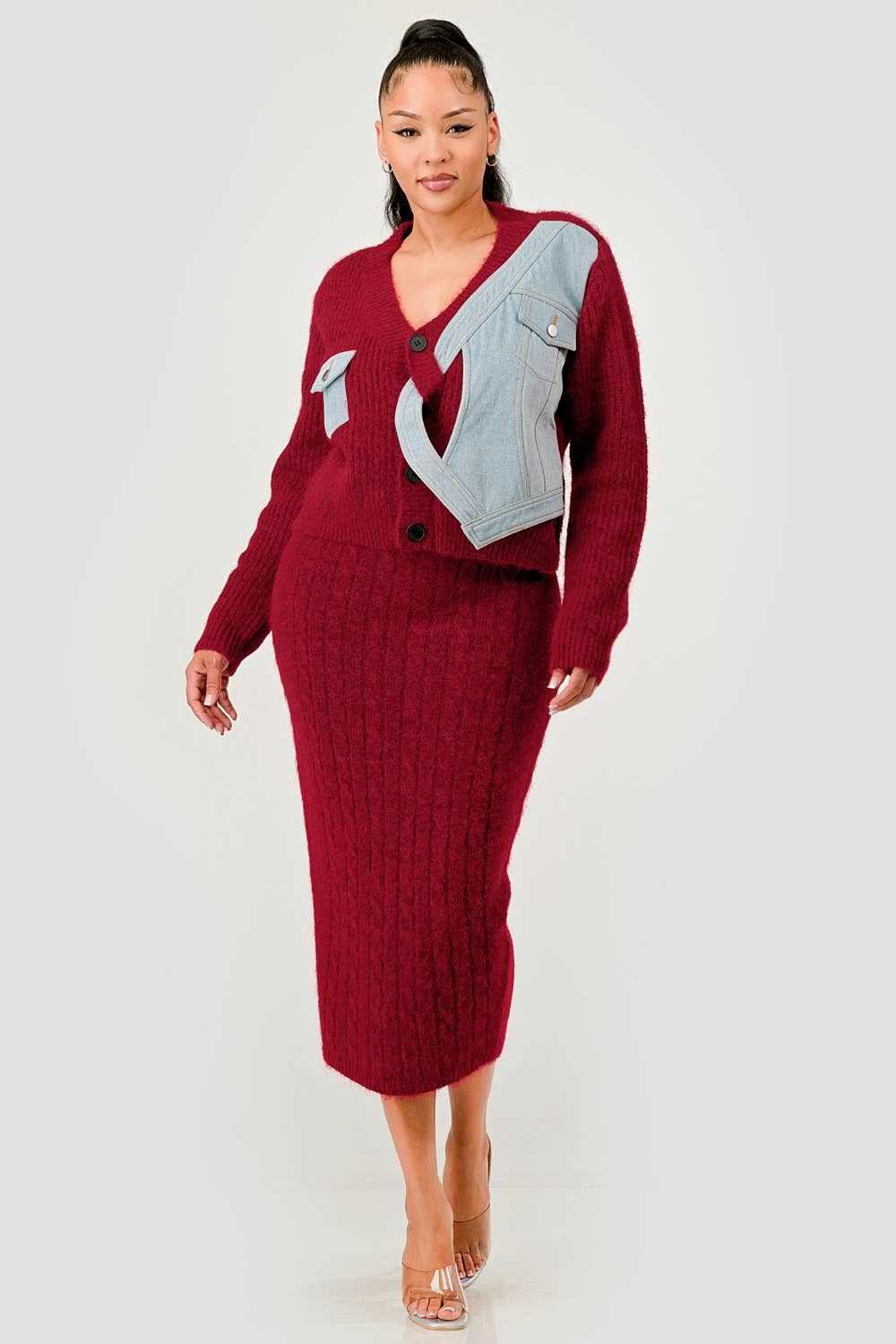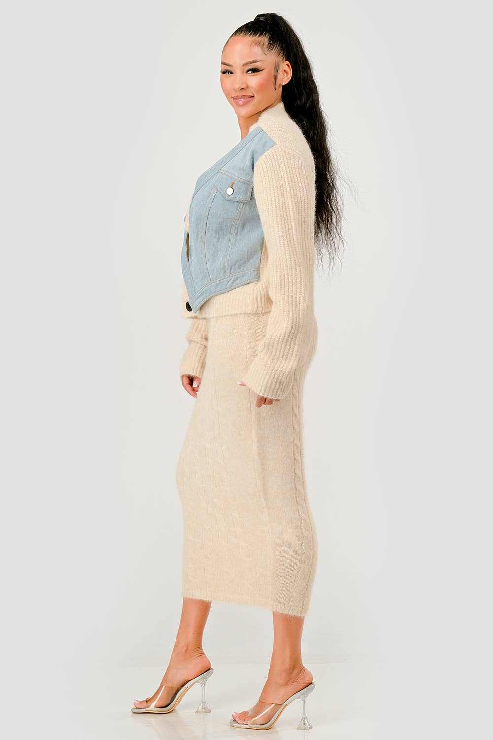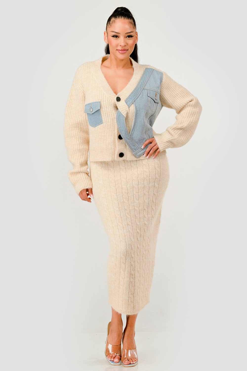 A cozy classic with a street-style twist, this two-piece set blends soft cable knit with bold denim accents. The button-front cardigan features contrast denim patchwork, including a pocket and asymmetrical jacket-style overlay for a unique layered look. The matching high-waist midi skirt offers a slim, flattering fit with timeless cable knit texture, making this set both comfortable and fashion-forward. Two-piece set: Cardigan top + high-waist midi skirt Cable knit skirt with soft stretch for a flattering fit Button-front cardigan with contrast denim patchwork Relaxed fit top with drop shoulders for comfort Soft, warm knit perfect for transitional weather