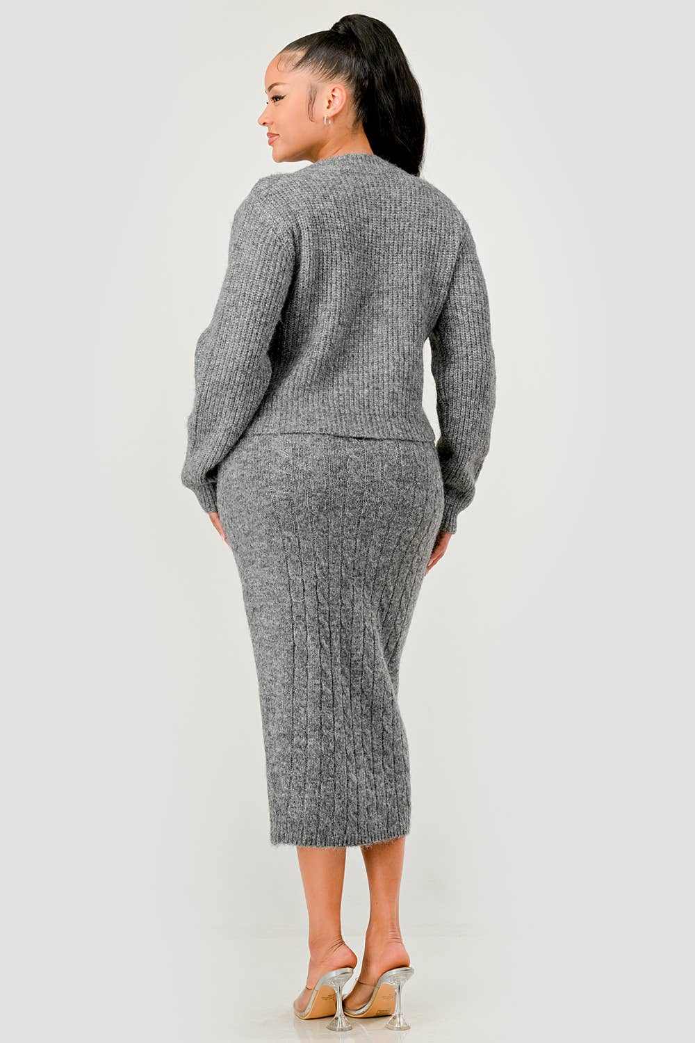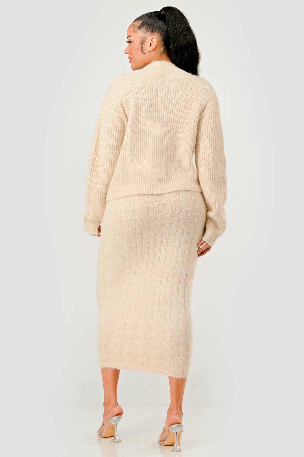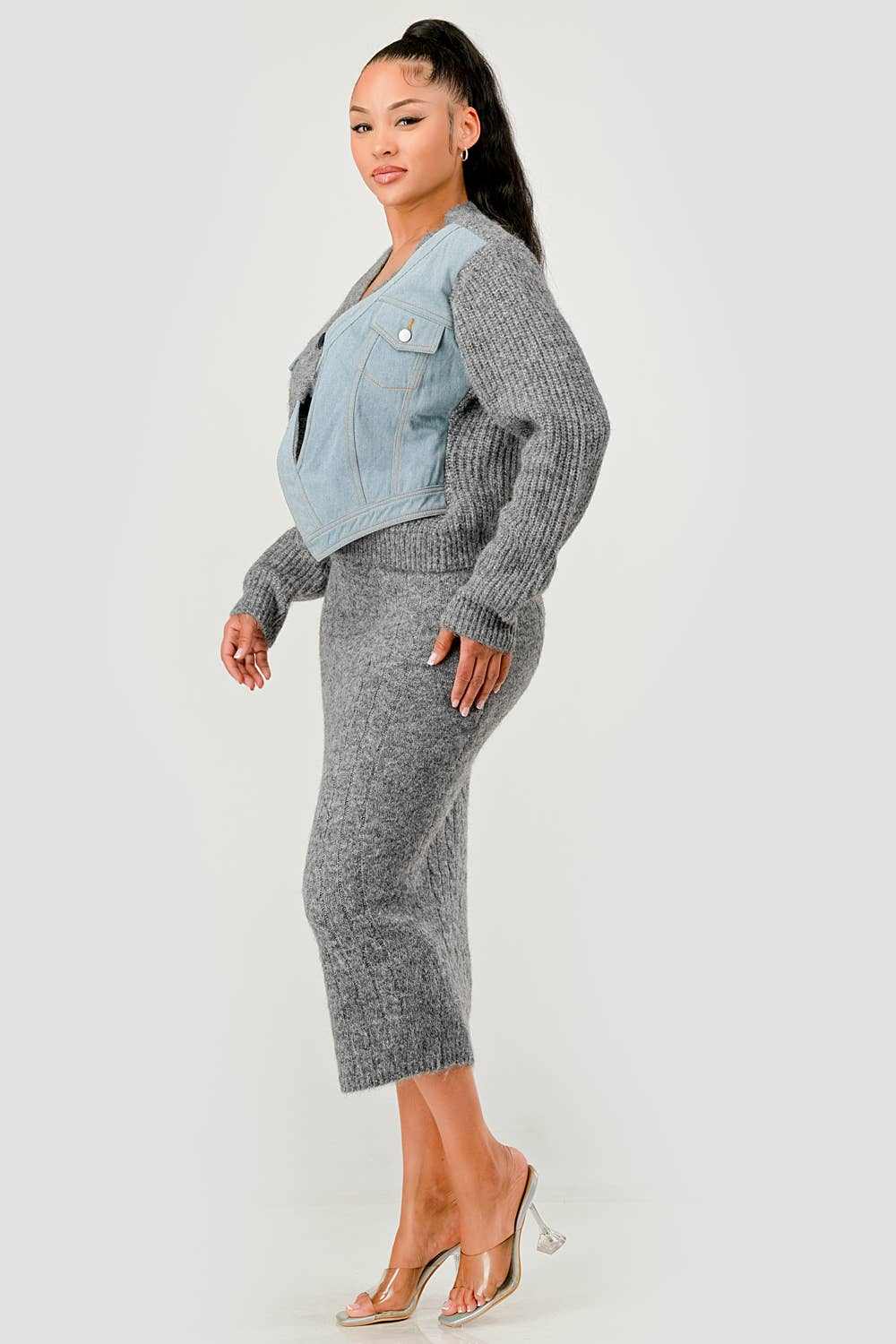 A cozy classic with a street-style twist, this two-piece set blends soft cable knit with bold denim accents. The button-front cardigan features contrast denim patchwork, including a pocket and asymmetrical jacket-style overlay for a unique layered look. The matching high-waist midi skirt offers a slim, flattering fit with timeless cable knit texture, making this set both comfortable and fashion-forward. Two-piece set: Cardigan top + high-waist midi skirt Cable knit skirt with soft stretch for a flattering fit Button-front cardigan with contrast denim patchwork Relaxed fit top with drop shoulders for comfort Soft, warm knit perfect for transitional weather