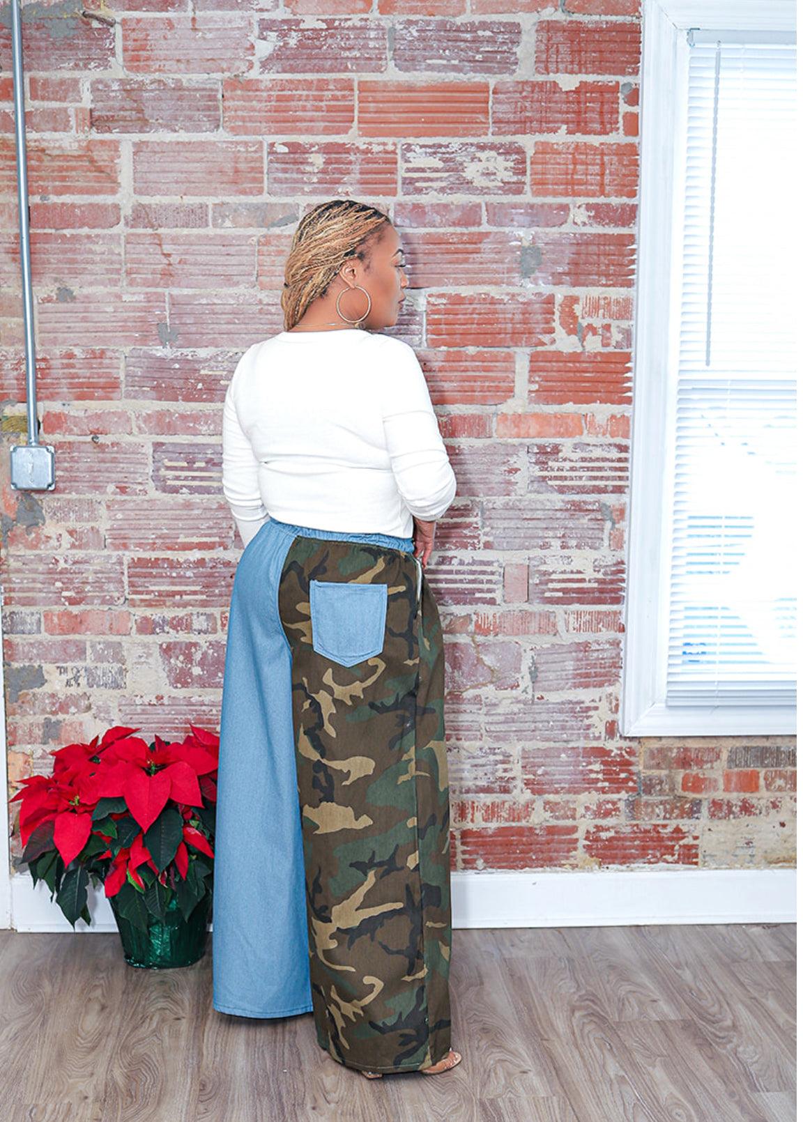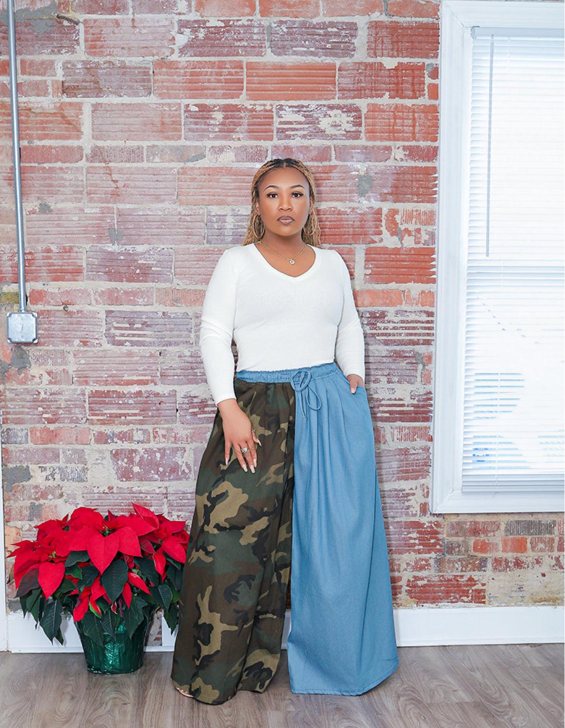 These statement wide-leg pants are where edgy meets effortless. Featuring a bold half-camo, half-denim design, they’re made to stand out while keeping you comfortable and confident.