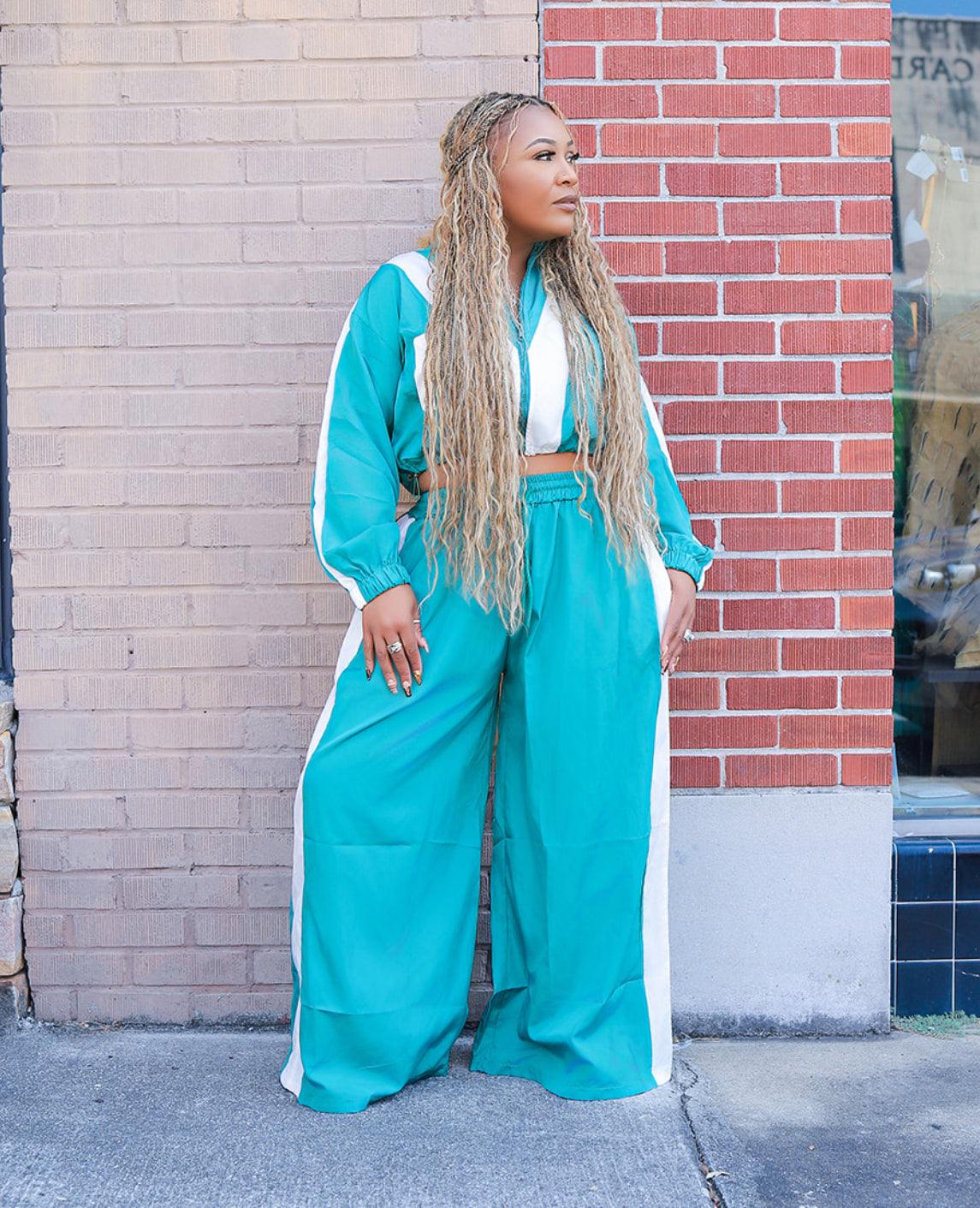 Turn heads in our Track Vibes Two-Piece Set, the perfect mix of sporty and chic! This lightweight set features a cropped zip-up jacket with long sleeves and matching high-waist wide-leg pants. The bold teal color with sleek white side paneling adds that retro-inspired edge, while the relaxed fit keeps you comfy without sacrificing style.