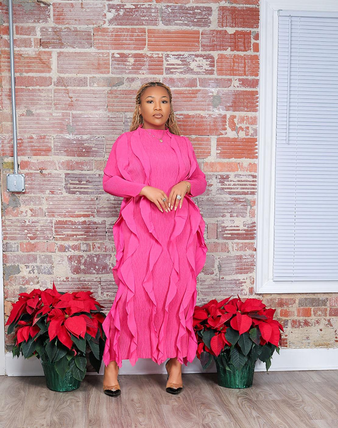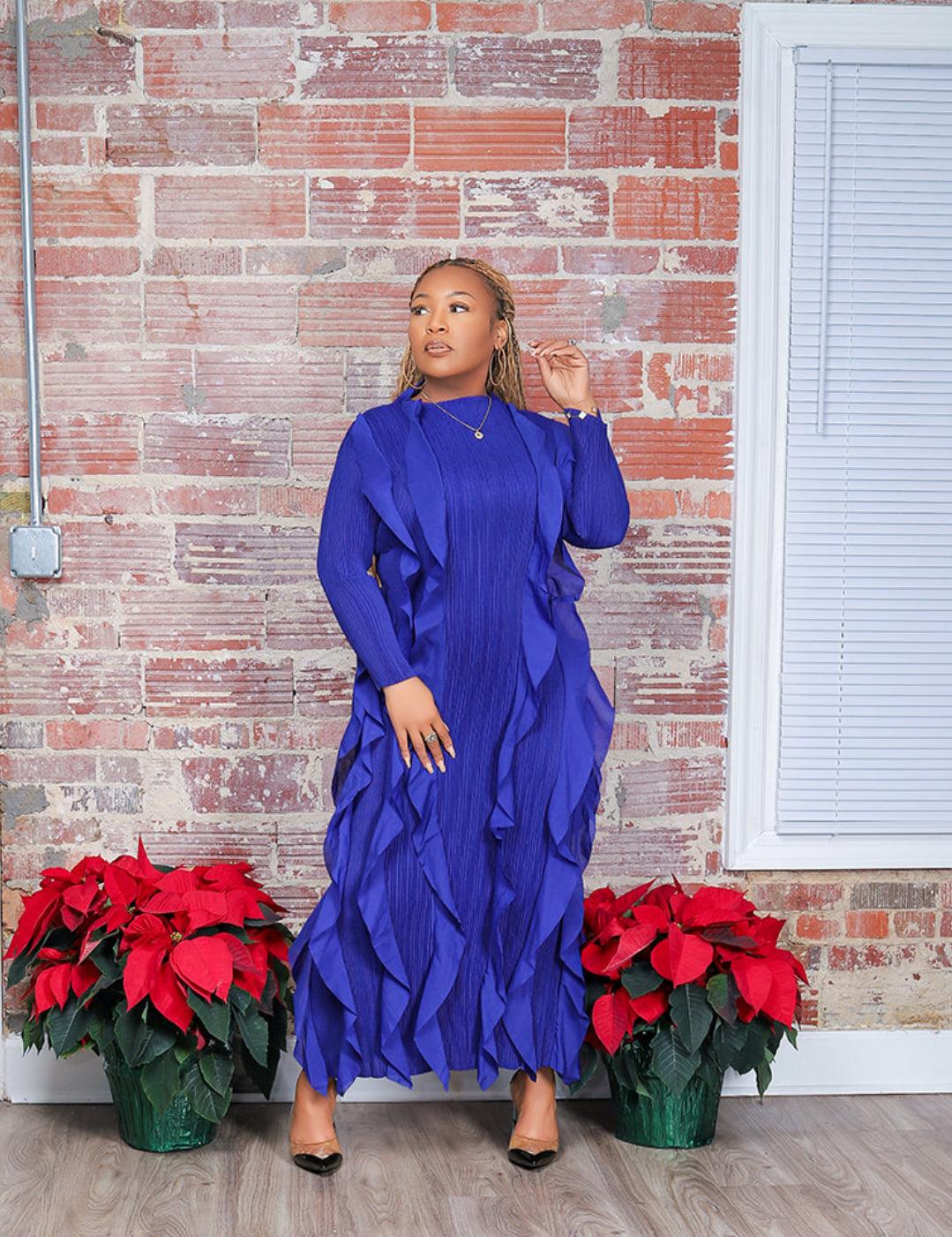Step into the room like you OWN it! This statement maxi dress gives effortless elegance with a playful twist. Designed with soft pleated fabric and cascading ruffle details, she moves with you and makes every entrance unforgettable.