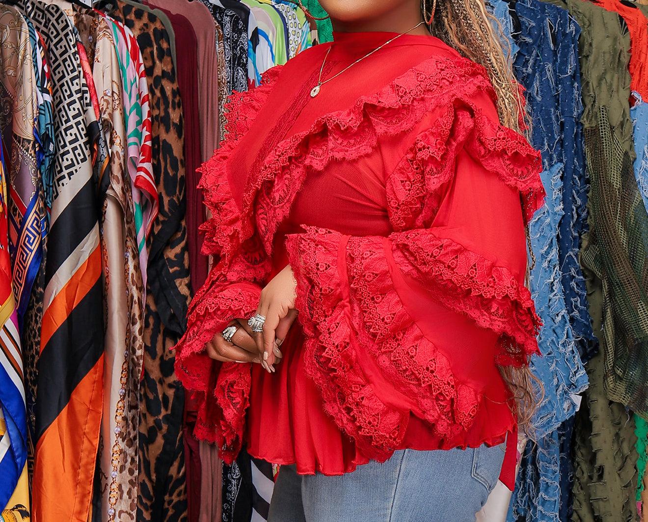 Step into confidence and class with our Ruffled Romance Blouse, a show-stopping piece that blends boldness and femininity in all the right ways. This elegant top features dramatic layered ruffle sleeves, a sheer lace detail bodice, and a flattering peplum waist that enhances your curves effortlessly. Whether you’re dressing it up for date night, pairing it with jeans for brunch, or styling it for a boss-babe photoshoot — this blouse is guaranteed to turn heads.