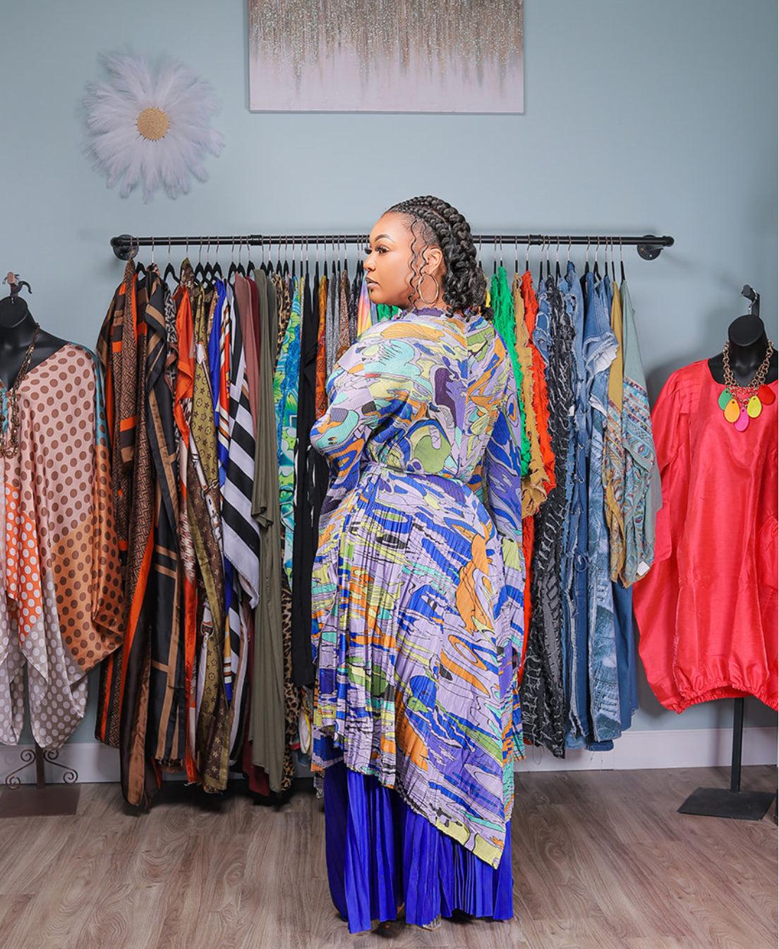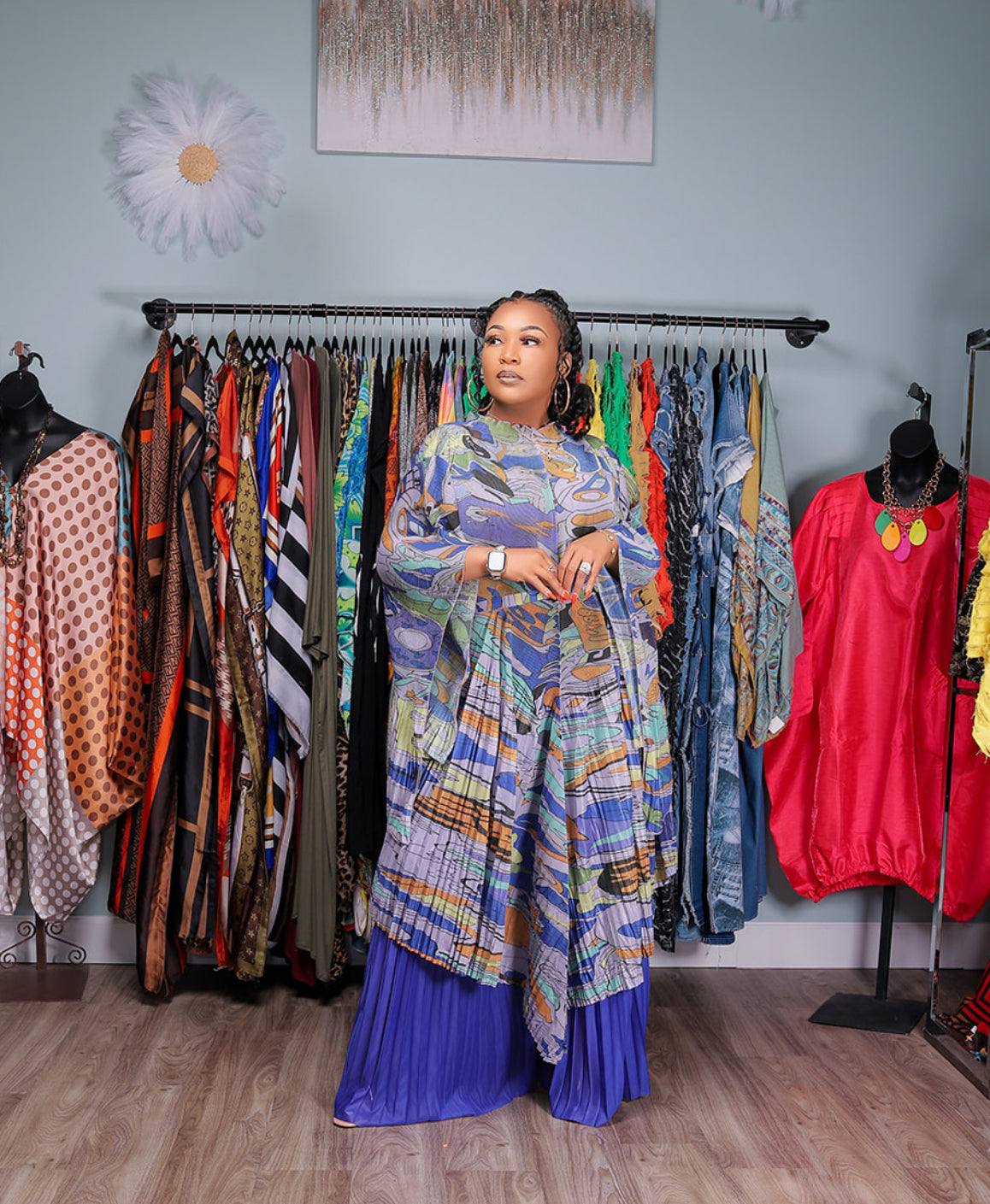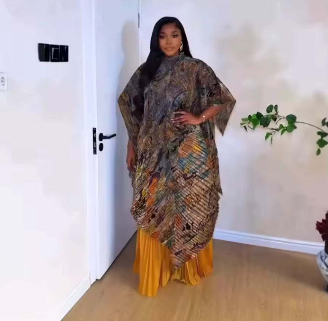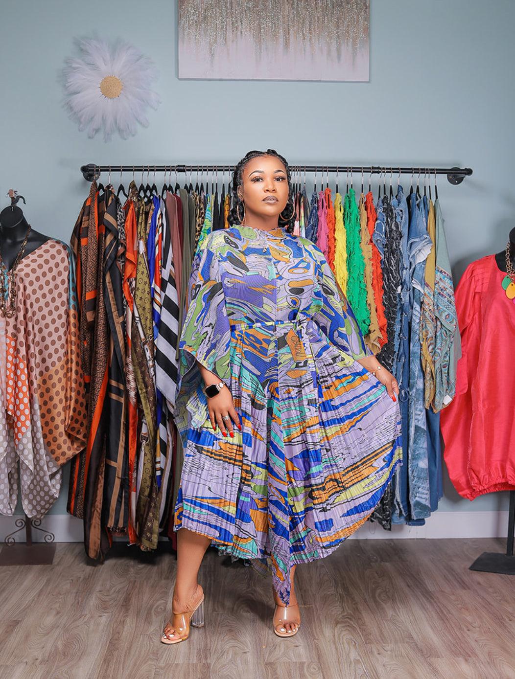 Turn heads in our Urban Goddess Kaftan Set, where comfort meets high fashion. This flowing kaftan features a striking mix of bold, abstract prints in vibrant hues  a true wearable work of art. Paired effortlessly with royal blue pleated wide-leg pants, this set delivers elegance, movement, and a touch of drama with every step.